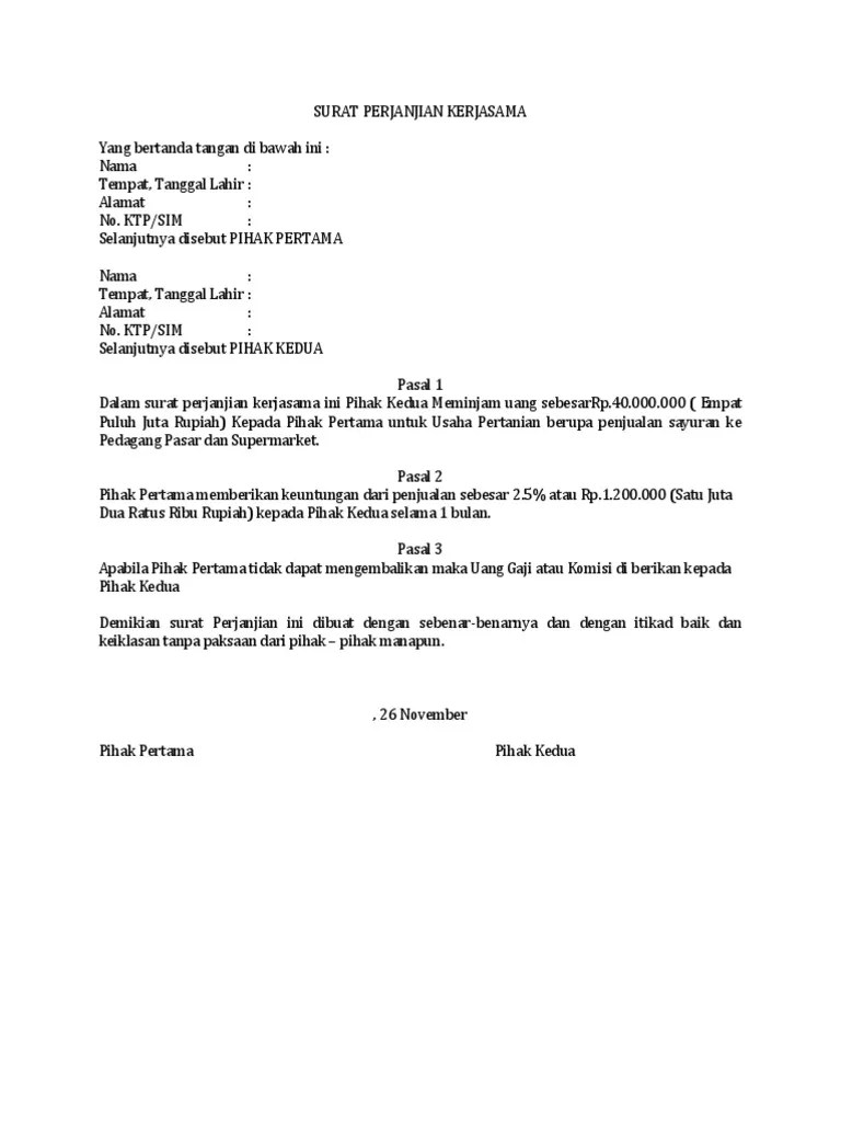 Pasal 4 jangka waktu 1. Untuk mendownload contoh surat kerjasama bagi hasil dalam format doc silahkan klik link yang tersedia berikut ini. Pihak pertama akan mendapatkan keuntungan bagi hasil usaha menurut persentase keuntungan yang telah disepakati bersama sebagaimana diatur dalam pasal 4. Surat perjanjian tersebut juga di buat di atas materai jadi tidak perlu khawatir jika terjadi sengketa dengan. Sekian dulu penjelasan singkat mengenai contoh surat permohonan kerjasama dalam kesempatan kali ini.